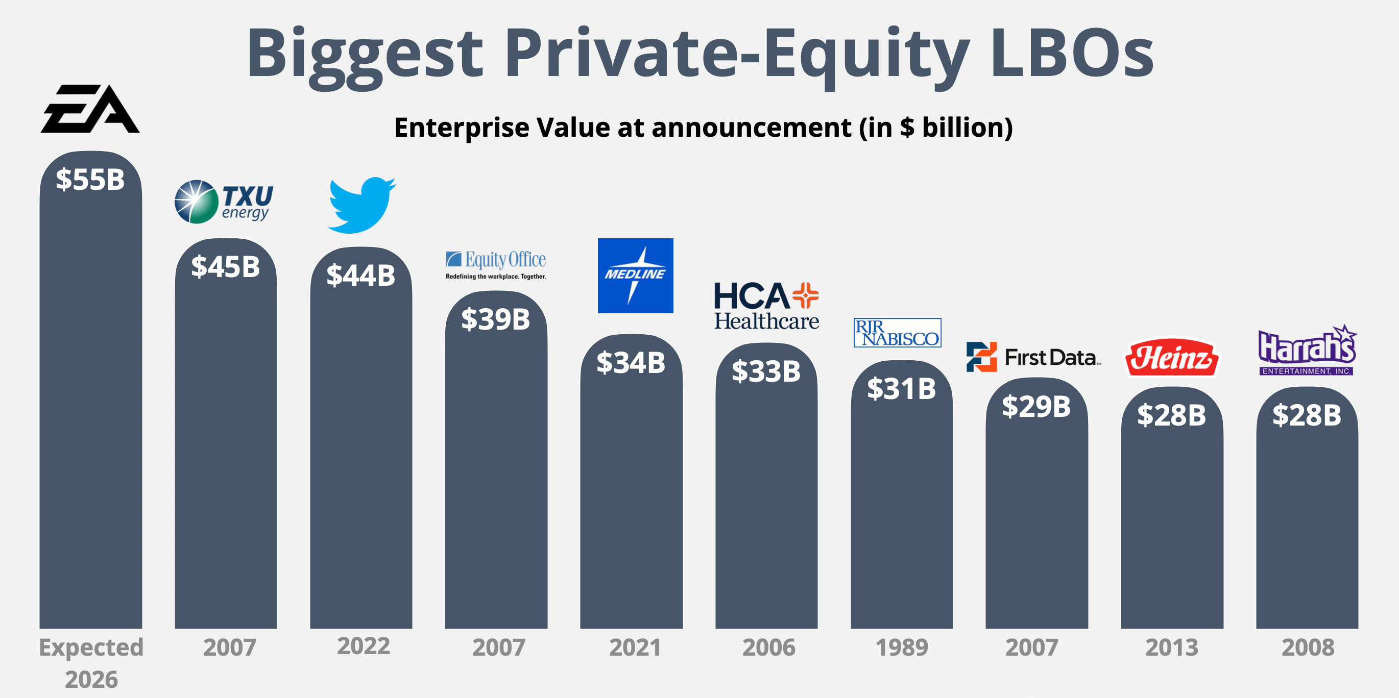 The size of this deal makes it the largest buyout ever by a pretty large margin. Microsoft's acquisition of Activision Blizzard was around $70 billion, but that was a strategic acquisition by a corporation, not a leveraged buyout by investors. EA at $55 billion sits far above most private market deals. In the gaming sector specifically, nothing has come close.